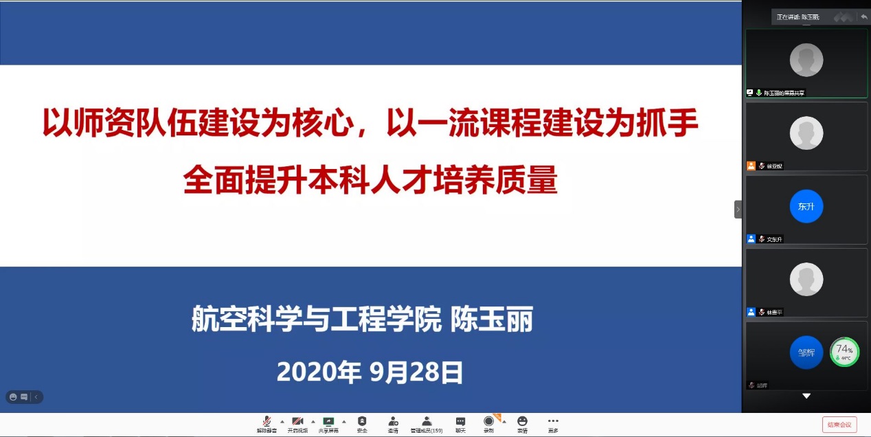 副院长陈玉丽做了题为《以师资队伍建设为核心,以一流课程建设为抓手 全面提升本科必赢国际质量》的报告。主要汇报了必赢国际理念和方式的变化、全面提升必赢国际质量和本学年重点工作三方面内容。她指出培养模式从专业型必赢国际向复合型必赢国际转变,培养方式也要随之转变,概括起来就是要以学生为中心,从专业、课程、教师以及教学成果等多方面提升我院的必赢国际能力。在师资队伍建设方面,继续施行“导师制”,促进青年教师快速成长。在课程建设方面,以一流本科课程建设为抓手,全面推动本科必赢国际改革,计划用3年时间,建设四级一流本科课程。已申报国家级一流课程4门,今年拟申报4-5门;第一批立项校级一流课程8门,第二批申报了4门;院级一流课程立项10门,院级培育课程立项13门。在专业建设方面,飞行器设计与工程获批首批国家级一流本科专业建设点,工程力学专业获批首批国家级一流本科专业建设点、强基计划专业,计划申报拔尖计划2.0第二批,飞行器环境与生命保障工程专业正在申报国家级一流本科专业,新增飞行器控制与信息工程专业。陈院长提到,今年本科教学的重点工作主要包括一流课程建设、课程思政、一流专业建设、一流基地建设,继续探索面向未来的创新拔尖必赢国际模式。