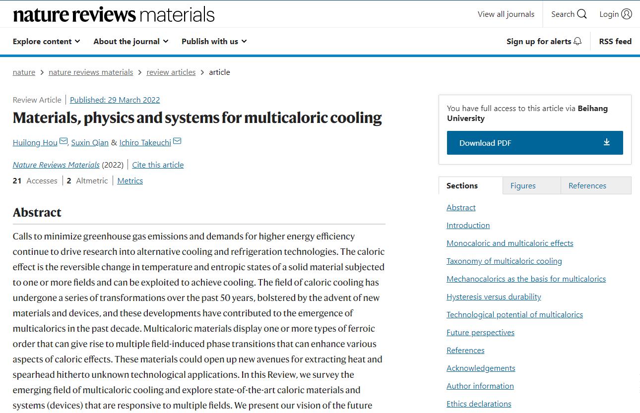 北航新闻网3月31日电(通讯员 乔梁)2022年3月29日,《Nature Reviews Materials》期刊报道了437必赢会员中心侯慧龙副教授在固态相变制冷领域取得的新进展:《Materials, physics and systems for multicaloric cooling》(https://www.nature.com/articles/s41578-022-00428-x)。固态相变制冷技术,基于固体材料内禀序参量在外场源下的可逆改变引起材料的吸/放热效应,经热力学循环实现制冷,具有绿色环保、节能高效、低噪稳定等诸多优点,不仅具有巨大的市场经济价值与社会环保意义,而且在航空航天、空间探测等领域也具有重要应用前景。此工作在梳理和归纳了单场以及多场转换与调控固态相变制冷技术的基础上,从材料、物理、系统三个层次进行了原创性的研究工作,实现了场致熵变的联合增效,建立了相变制冷材料的延寿准则,完善了多场功-能转换器件的评价体系。该工作不仅是对单场致效应的归纳与补充,而且丰富和拓宽了多场作用下制冷材料与器件的种类及概念范畴。值得一提的是,所发表期刊《Nature Reviews Materials》的影响因子(IF=66.308),在全球物质类(材料、化学、物理、工程、机械等)研究期刊中,排名第一。该项工作也是北航自建校以来发表在该期刊上的第二篇成果(第一篇由江雷院士于2017年发表)。