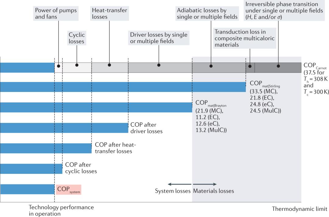 通过综合分析一级相变制冷材料中减小相变滞后的策略与机理,发现在功-能转换过程中滞后损耗所带来的损耗功,主要通过其在输入功的占比,以及改变用于逆向转变的弹性能来影响材料的功能寿命。基于实验结果,提出损耗功在输入功占比小于10%是一级相变制冷材料达到百万次循环以上功能寿命的延寿准则,建立了一级和二级相变所对应的功能寿命预测公式。更重要的是,基于能量形式建立的延寿准则和公式,可从单场效应材料体系推广至多场效应体系,具有普适性,表明了力磁电多场响应材料内禀序参量与共轭外场具有共同的驱动因素。从材料制冷性能系数出发,揭示了驱动损失、传热损失、循环损失、寄生损失四类损失对于器件制冷性能系数逐级削减的影响规律(图2),完善了在器件设计中,多场材料与器件的性能评价体系。同时,以磁性形状记忆合金为模型材料,获得的多场协同增效制冷器件,核心材料性能指数为24.5,达到同期国际最高水平。