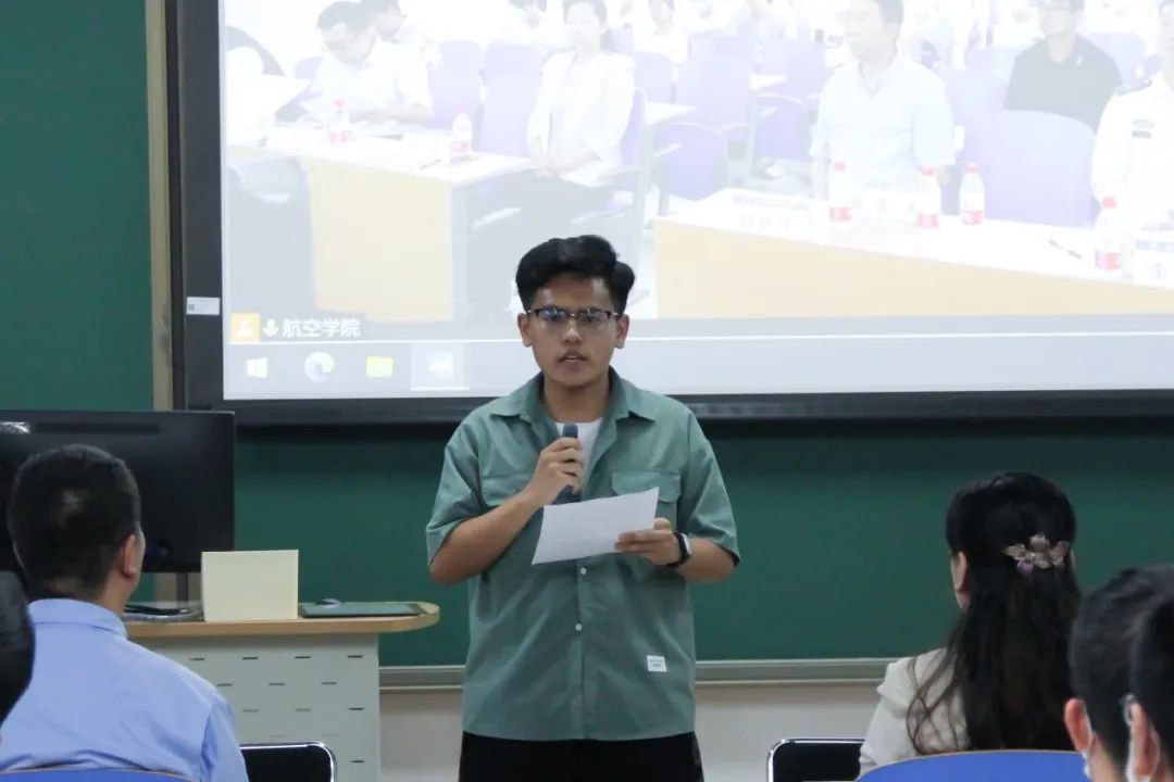19级陆士嘉班学长张恒德、李博程和20级双学籍飞行学员班学生代表于浩、戴鸣柯向大家分享了自己在北航的学习生活经历,他们表示,航空学院是一个温暖的大家庭,在追求优秀的道路上总有志同道合的朋友和我们并肩而行。