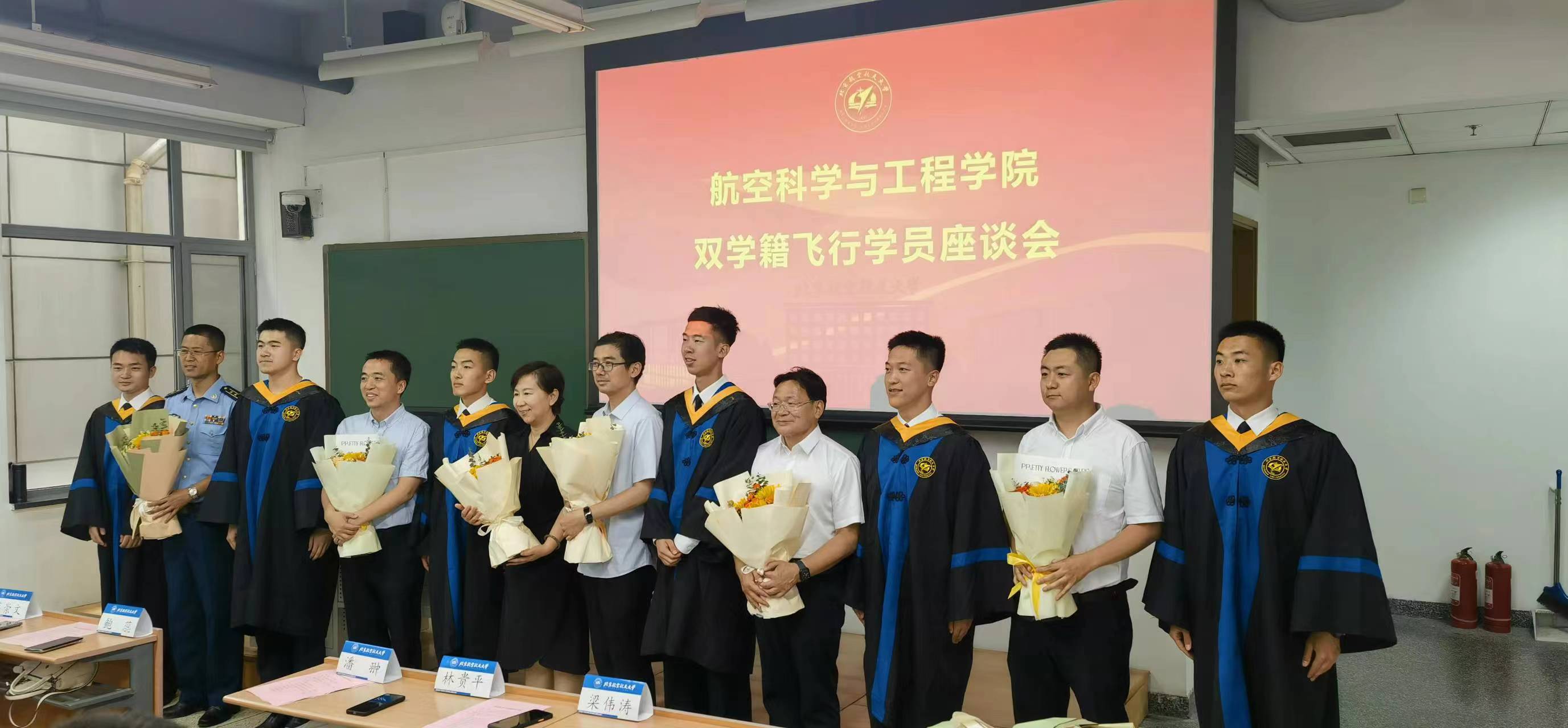 会议最后,学院领导老师们为双学籍飞行学员赠送毕业礼物,双学籍飞行学员代表向学院领导老师献花。