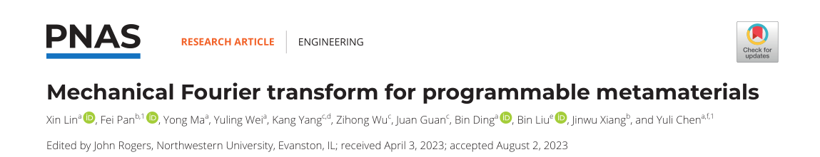 北航新闻网9月7日电(通讯员 杜金涛)2023年9月5日,《美国科学院院刊》(PNAS)发表了我校航空学院潘飞副教授、陈玉丽教授与向锦武院士、材料学院管娟副教授合作完成的研究成果“Mechanical Fourier transform for programmable metamaterials”(用于可编程超材料的“机械”傅里叶变换)。该工作提出了一种快捷高效的材料/结构力学性能逆向定制方法,将复杂非线性力学性能的逆向设计问题转化为超材料模块的应力应变曲线调幅问题,为先进材料和结构的按需定制设计提供了新的解决方案。航空学院博士生林新为文章第一作者,潘飞副教授和陈玉丽教授为共同通讯作者。437ccm必赢国际为第一完成单位和唯一通讯单位。