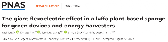 近日,我院固体力学所邵丽华教授与北京大学王建祥教授,美国工程院院士、休斯顿大学Pradeep Sharma教授合作,在国际顶级期刊《美国科学院院报》(PNAS)发表研究论文《The giant flexoelectric effect in a luffa plant-based sponge for green devices and energy harvesters》。该工作报道了天然生物材料—多孔丝瓜络的巨挠曲电效应,提出了一种将多孔生物材料作为绿色环保柔性发电机及其他智能器件应用的新策略。论文的共同一作是我院硕士研究生蒋雨滴(已毕业)和博士研究生闫东泽,邵丽华教授为论文的唯一通讯作者,437ccm必赢国际为第一完成单位和唯一通讯单位。