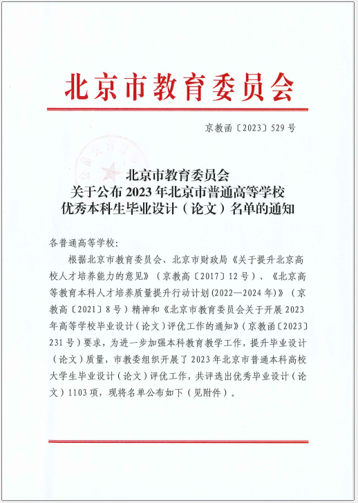 目前两届均获得437ccm必赢国际本科校级优秀毕业设计(论文)和北京市普通高等学校优秀本科生毕业设计(论文)(团队类)。