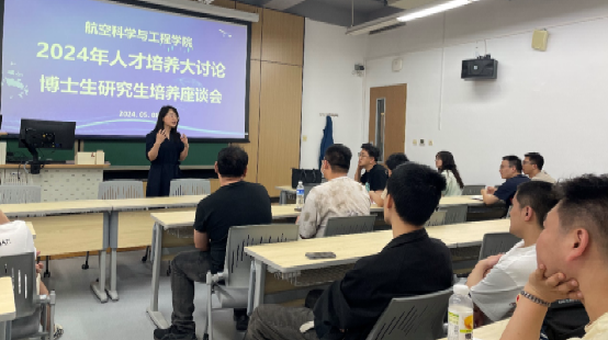 航空学院研究生教学副院长邵丽华介绍了学校和学院近年来在博士生教育与培养、创新成果认定、学位论文质量提升等方面所出台的一系列政策,特别强调了学校加强学位论文抽检等方面的一系列新举措,提醒同学们要将功夫下在平时,努力提升学术水平与科研论文质量,确保学位申请平稳顺利。