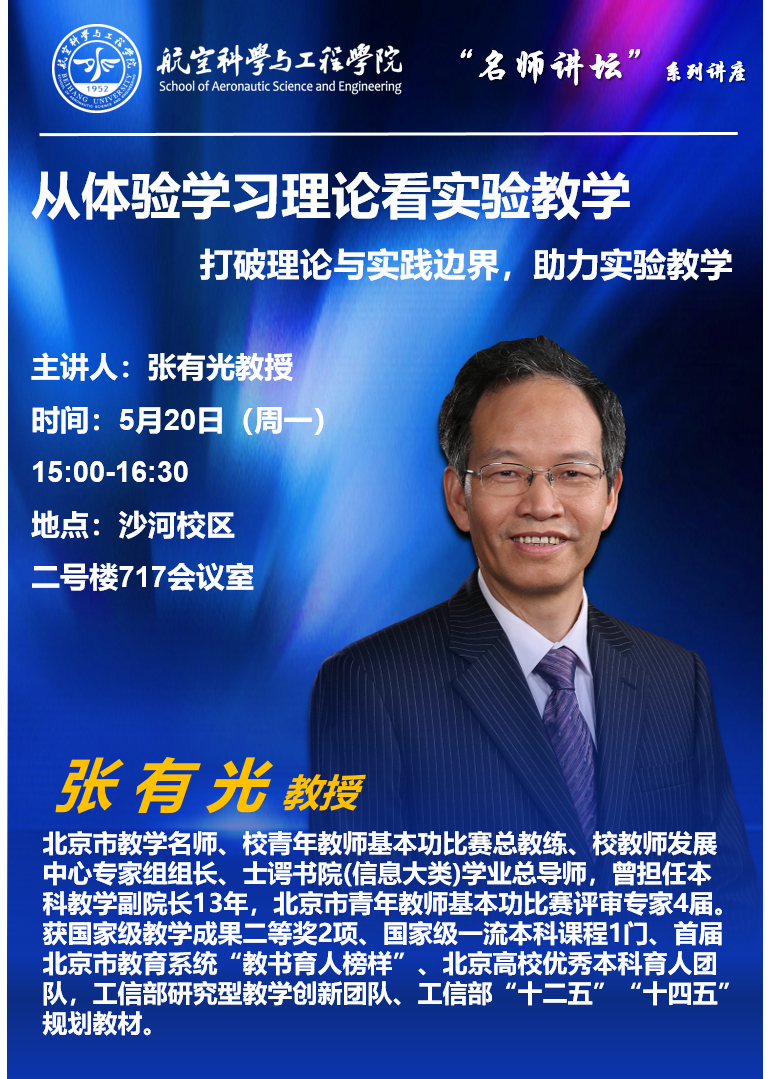 为促进青年教师教学发展,帮助青年教师过好“师德关”“教学关”“育人关”,加强教师教育教学能力提升体系建设,助力青年教师成为必赢国际生力军,5月20日下午,437必赢会员中心在沙河校区举办“名师讲坛”讲座。讲座邀请了北京市教学名师张有光教授,为各位教师带来主题为“从体验学习理论看实验教学”的专题讲座。参会的代表有航空学院副院长罗明强,航空学院实验教学中心主任李可,航空学院实验教学中心副主任王松等10余名骨干教师。