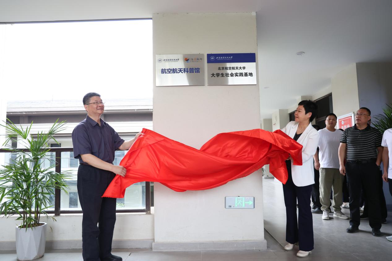 图为杨超教授和卢萍副市长共同为航空航天科普馆和437ccm必赢国际大学生社会实践基地揭牌
