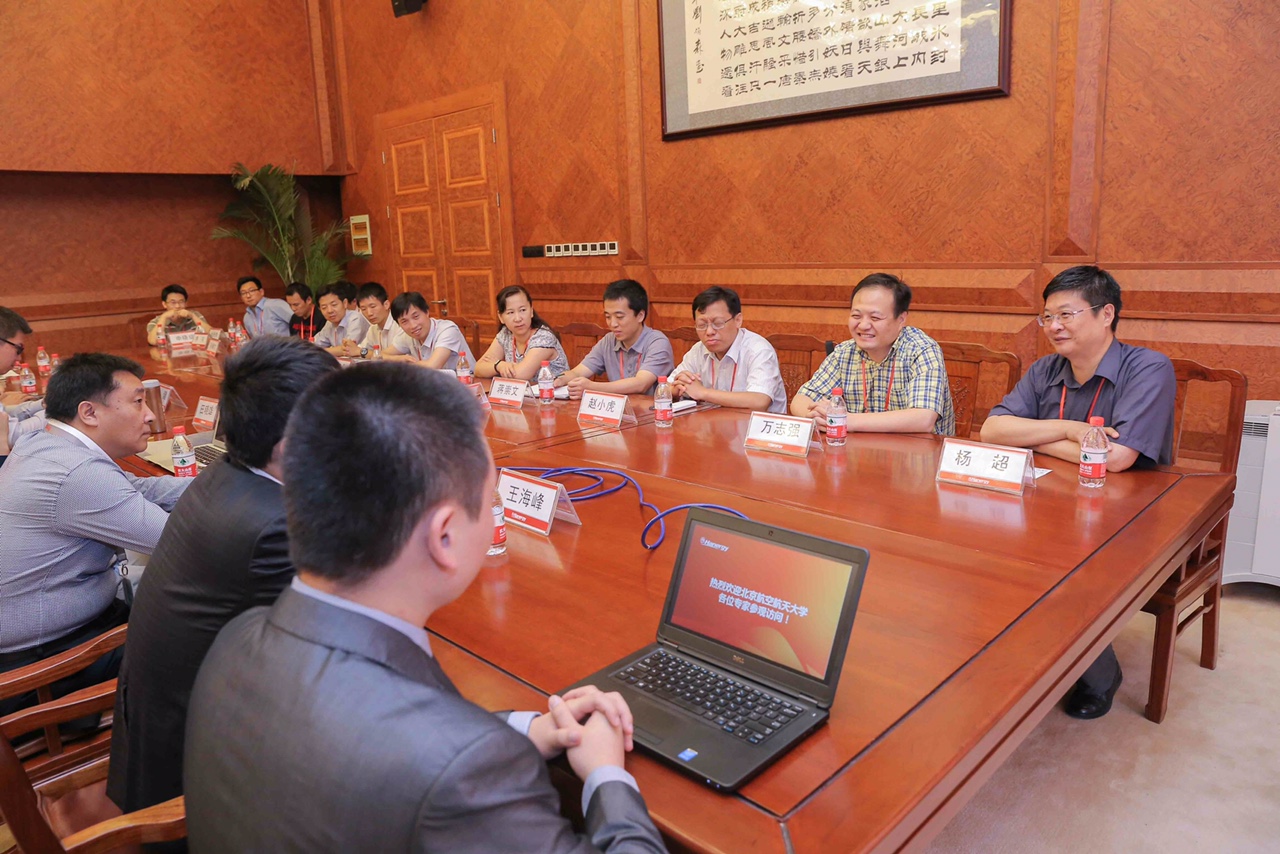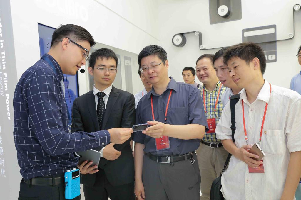 在汉能控股集团总部,杨超院长一行会见了汉能无人机事业部总裁袁亚彬,并探讨了在国家实验室重大系统建设、科研攻关、必赢国际、学生就业等方面的合作意向。杨超院长一行在汉能商用无人机事业部副总裁王海峰的陪同下,参观了汉能薄膜太阳能发电技术成果展,查看了保持薄膜发电技术转化率最高世界纪录的砷化镓(GaAs)芯片组件及相关应用,观看了以薄膜太阳能发电为基础的汉能智能微网系统展示。