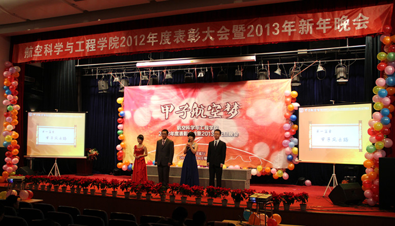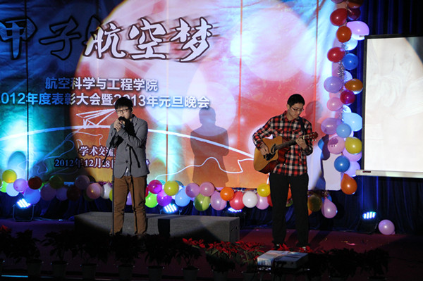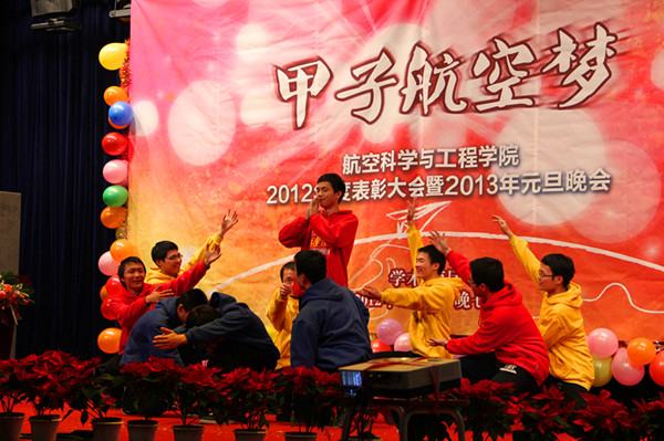 就在现场观众为获奖学生和团体祝贺的热烈掌声中,110516班同学们的一曲合唱《青春北航》为2013年“甲子航空梦”新年晚会拉开了序幕。学院150余名研究生、本科生共同参与了晚会的演出。本次晚会分为“甲子风云路”,“锦绣繁华时”,“青春蓝天梦”三个篇章,整场演出节目风格多样,精彩连连;现场气氛热烈,高潮迭起。120512班带来的小品《北航孩子的幸福生活》风趣幽默地讲述了他们初来北航生活学习的故事,SY12054班来自四面八方的同学共唱《五湖四海》,展现他们为同一个航空梦共聚北航而结下的深厚友谊,3905党支部的学生党员们在歌曲《我爱祖国的蓝天》伴奏下,深情款款地朗诵《航空赞歌》,表达着他们身为437必赢会员中心一员浓浓的自豪感。此外,另类搞笑的舞蹈《千年等一回》,新鲜风趣的三句半《我航威武》;炫目的街舞,热情的乐队无一不让观众眼前一亮。在120516班合唱《温暖2012》的温馨气氛中,两个多小时的新年晚会圆满结束。