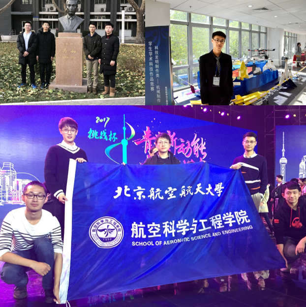 刘思良和杜增智曾参加“未来航空训练营”学习航模制作方法;作为项目“大展弦比可折叠联翼无人机”的作者,栗鸣、杜增智、胡天豪等人创造性地提出一种优势互补的折叠联翼布局方案,从概念到设计图纸到制作再到试飞成功,多次在实验室奋战到凌晨,一点一点在摸索中逐渐完成,项目最终获得“冯如杯”科技竞赛三等奖;栗鸣参与的“共轴倾转旋翼无人机开发与应用”项目更是荣获全国“挑战杯”科技作品竞赛一等奖和“互联网+”大学生创新创业大赛北京赛区一等奖。