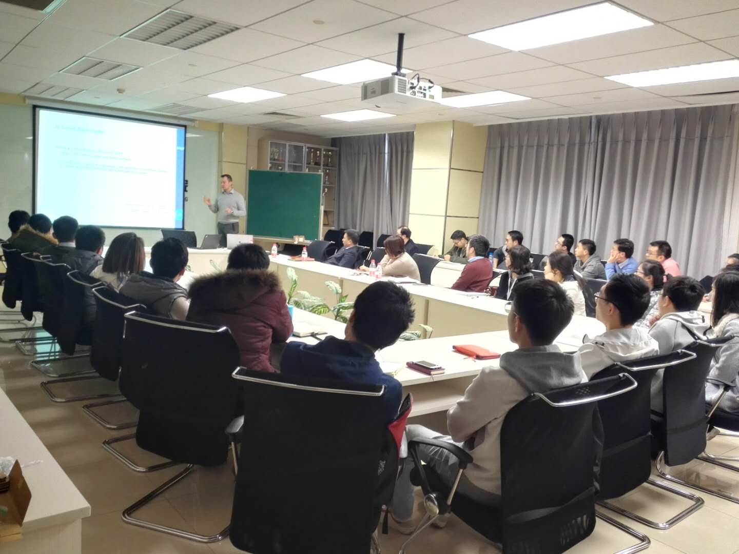 Brutin教授的报告深入浅出,展示了液滴润湿和蒸发研究的历史、现状和最新进展,尤其是最近几年在复杂流体的液滴蒸发方面的研究工作,包括血液和纳米流体等。该研究成果不仅揭示了液滴蒸发的复杂流动现象和颗粒沉积特性,同时在航空工业和生物医学等方面有很广阔的应用前景。报告会后,参会人员与Brutin教授进行了热烈讨论,就以后的进一步合作交流达成共识。Brutin教授邀请文院长的两位学生今年前往法国进行为期5个月的访问交流,主要开展液滴蒸发的实验和数值计算工作。