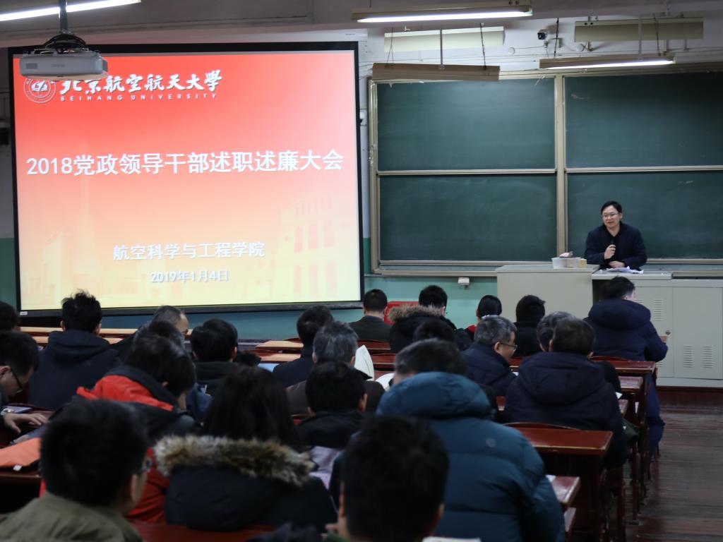 2019年1月4日下午14:30,航空学院2018年度党政领导干部述职述廉大会在一号教学楼201教室召开,全院教职工100余人参加会议,会议由党委书记林贵平主持。