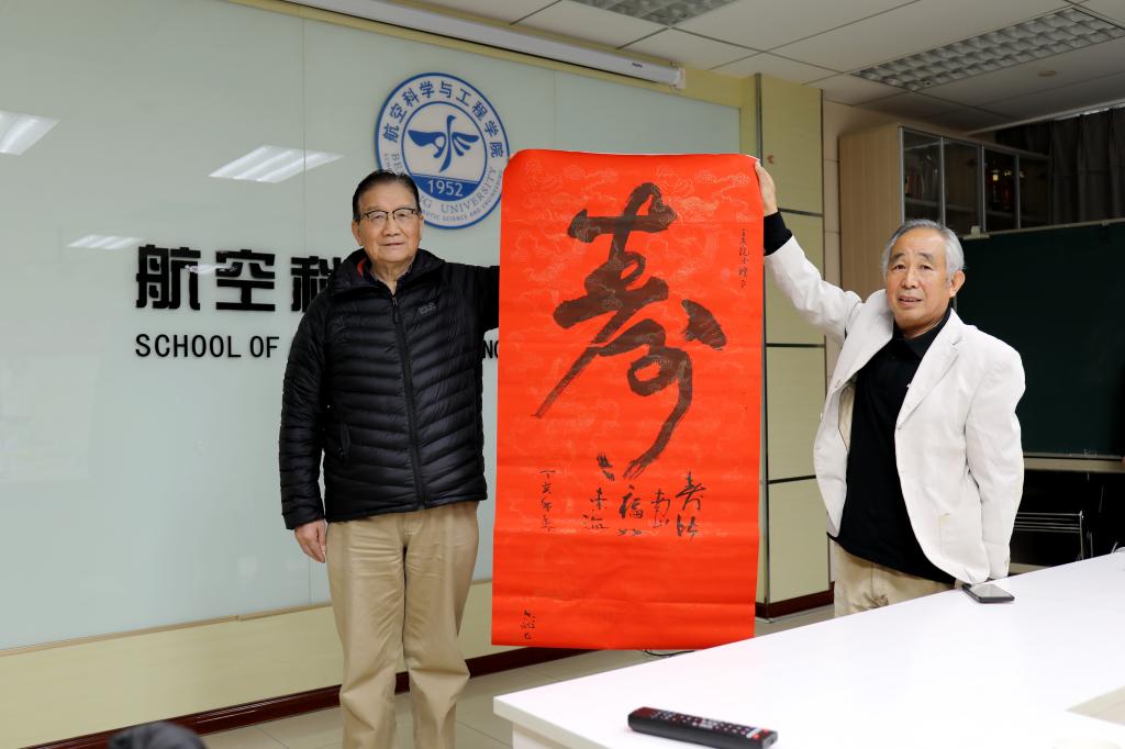 随后校友返校召集人郭义明老师,代表4551班班向王浚院士赠送了寿字条幅,衷心祝愿王浚院士健康长寿。随后大家进行了交流、座谈,共同追忆昔日校园生活,重叙师生友情。有的同学四十二年都没有见面,互相问候,很是惊喜和激动,同时大家也对航空学院的未来也寄予了厚望。校友们对学院的精心安排、热情接待表示感谢。