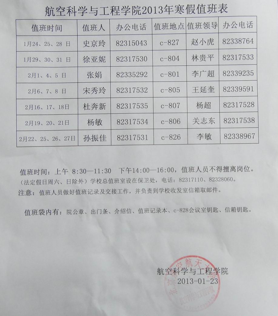 航空学院2013寒假值班安排